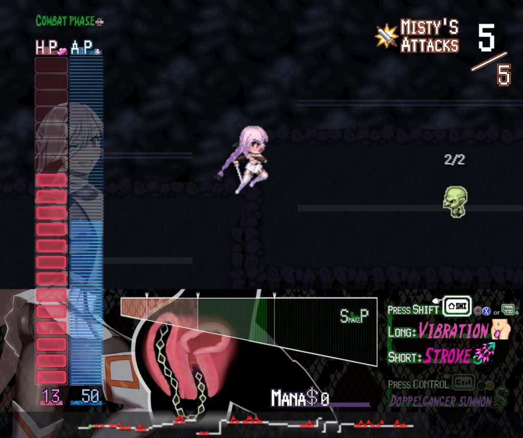 ミスティの両穴に入り込んだ蛇神は振動や突き上げでAPを削ることができるので、タイミングを見計らってミスティを絶頂させることで大ダメージを与えることができる。