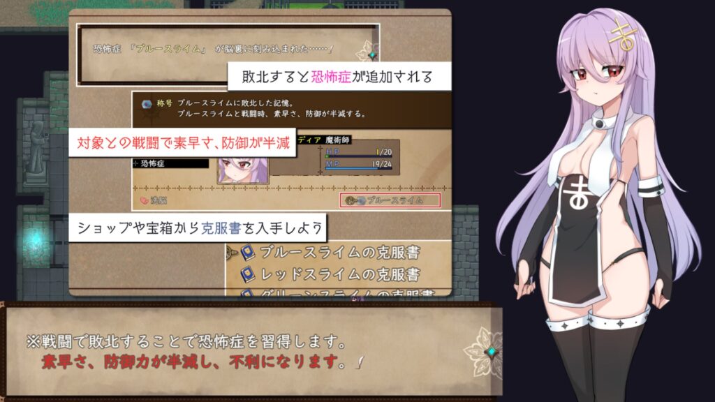 戦闘で敗北すると、敗北した種類の敵の”恐怖症”が付与される。
