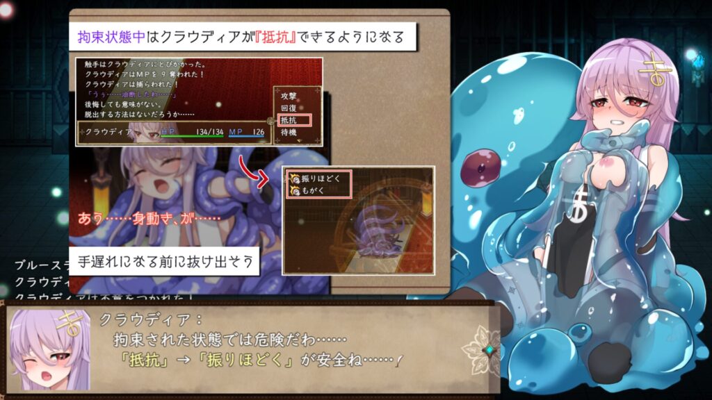 拘束されるとMPは吸われるし魔力は下がるしで戦闘なんかできるかという感じなので早急に抜け出さないととっても危険。